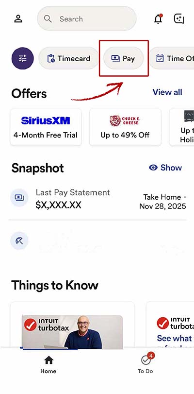 3. Select the PAY from the menu options. This will bring you to your pay activity.