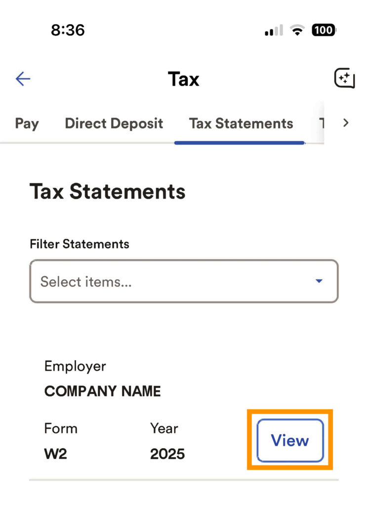 - Select TAX STATEMENTS (at the top) to view your tax forms (if available).