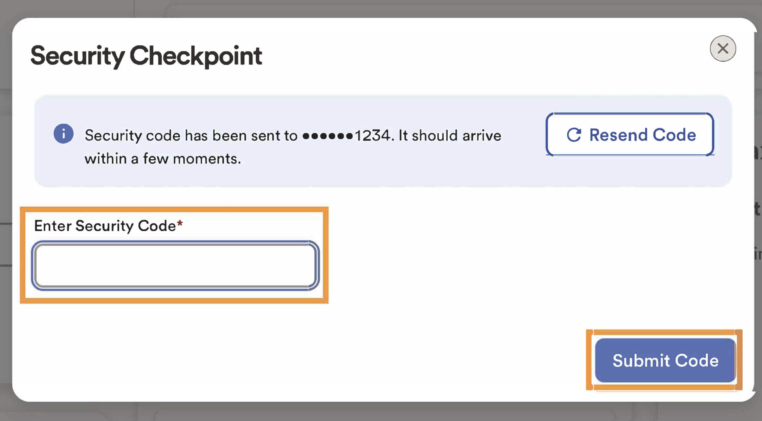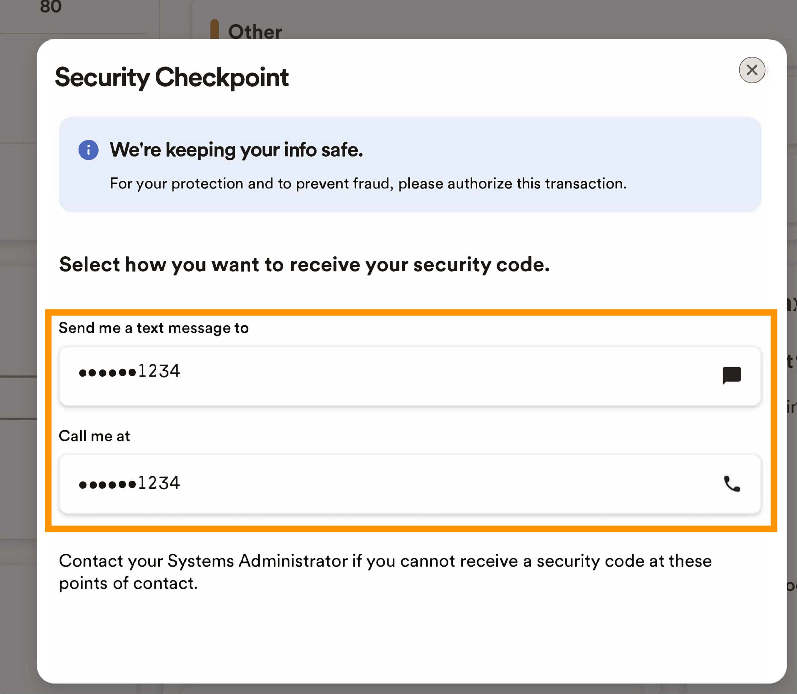 7. You should be prompted at a Security Checkpoint. Select your preferred delivery option to obtain a security code.